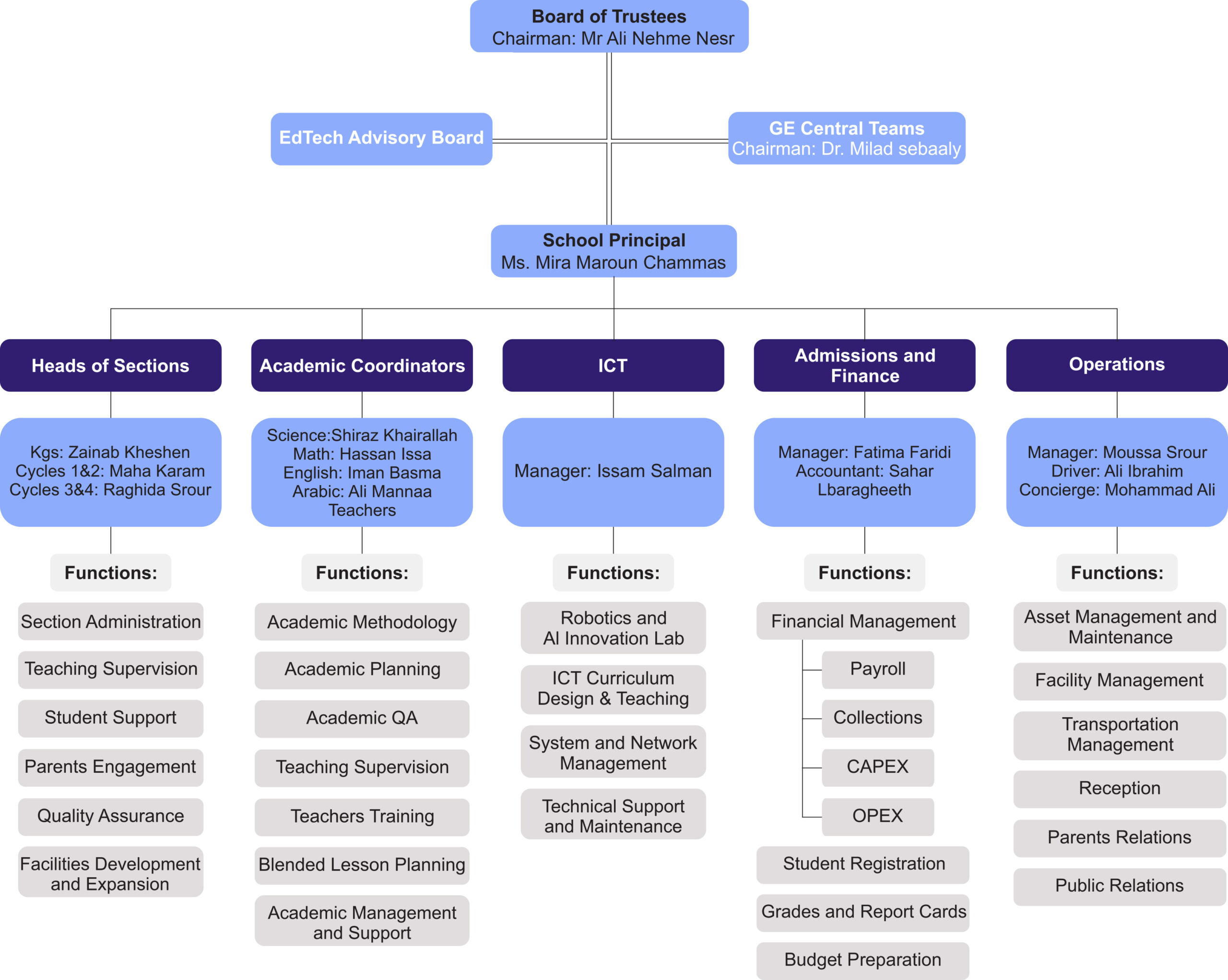 يرفع مجلس إدارة المدرسة تقاريره مباشرة إلى فريق Global Education المركزي، ومجلس الأمناء.